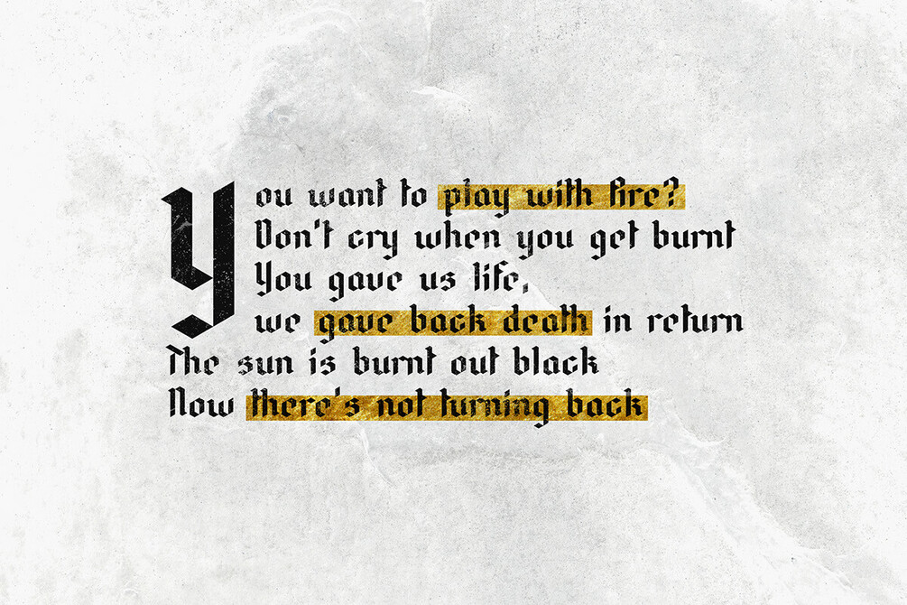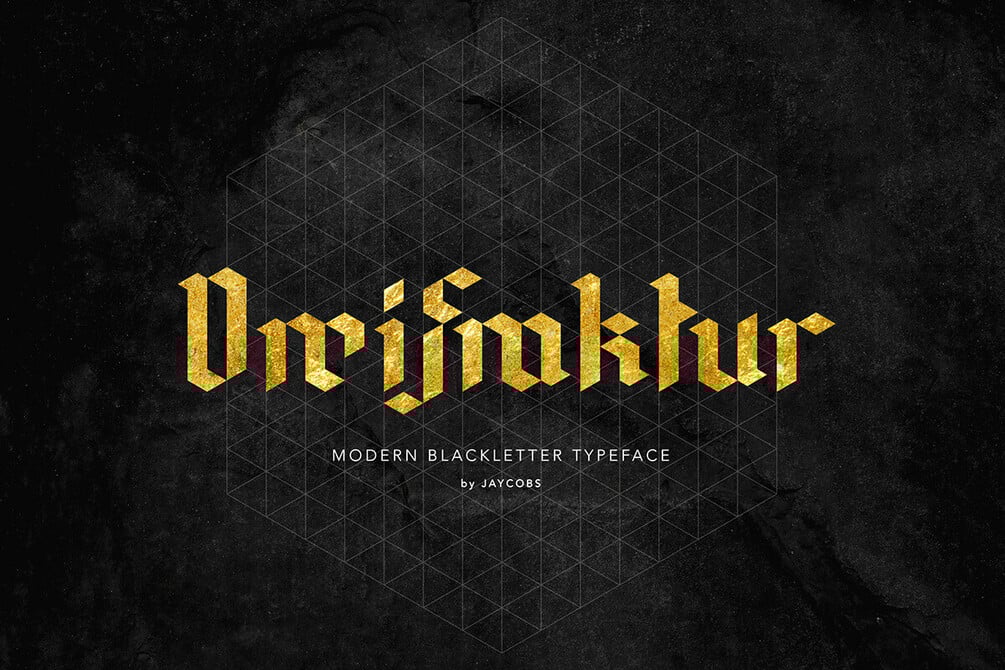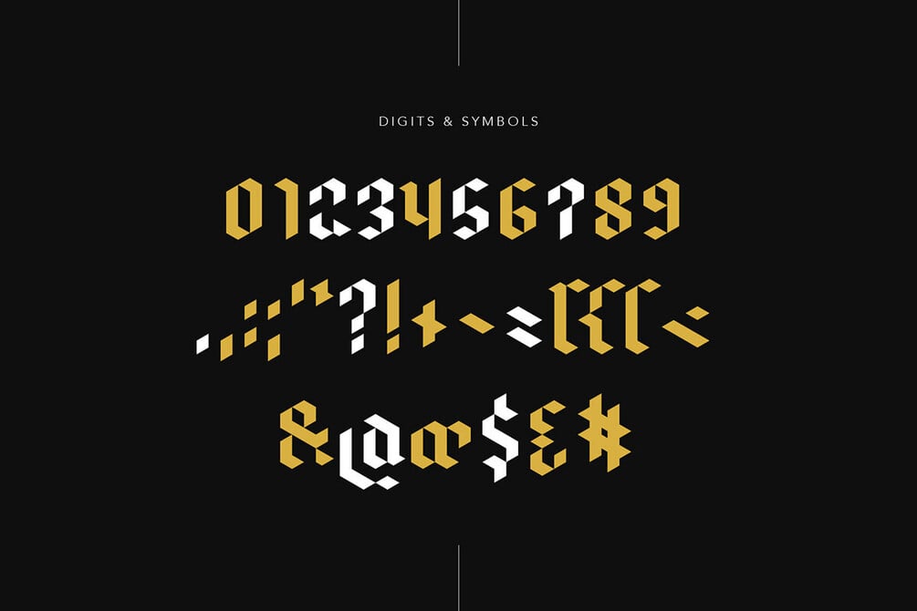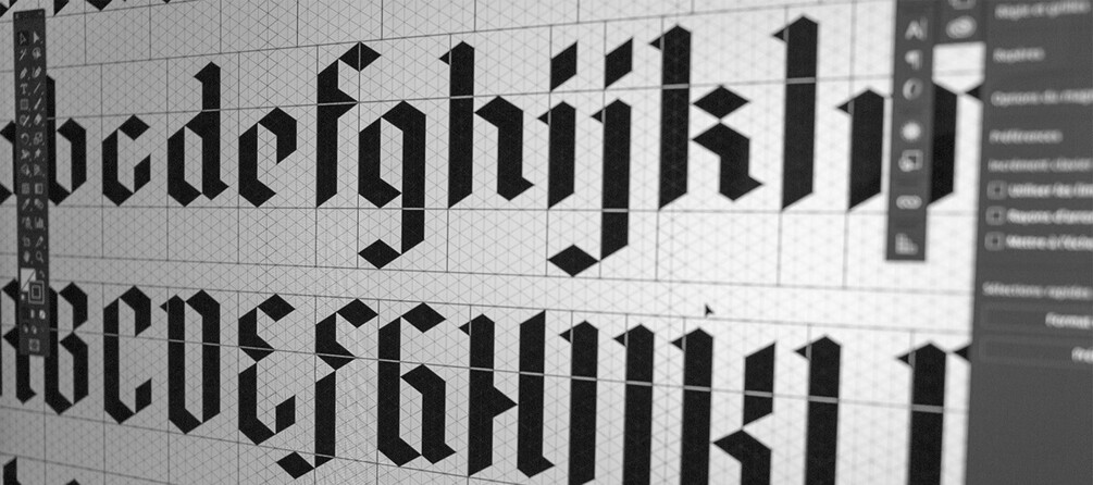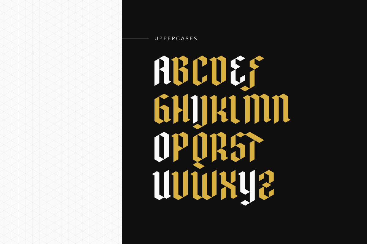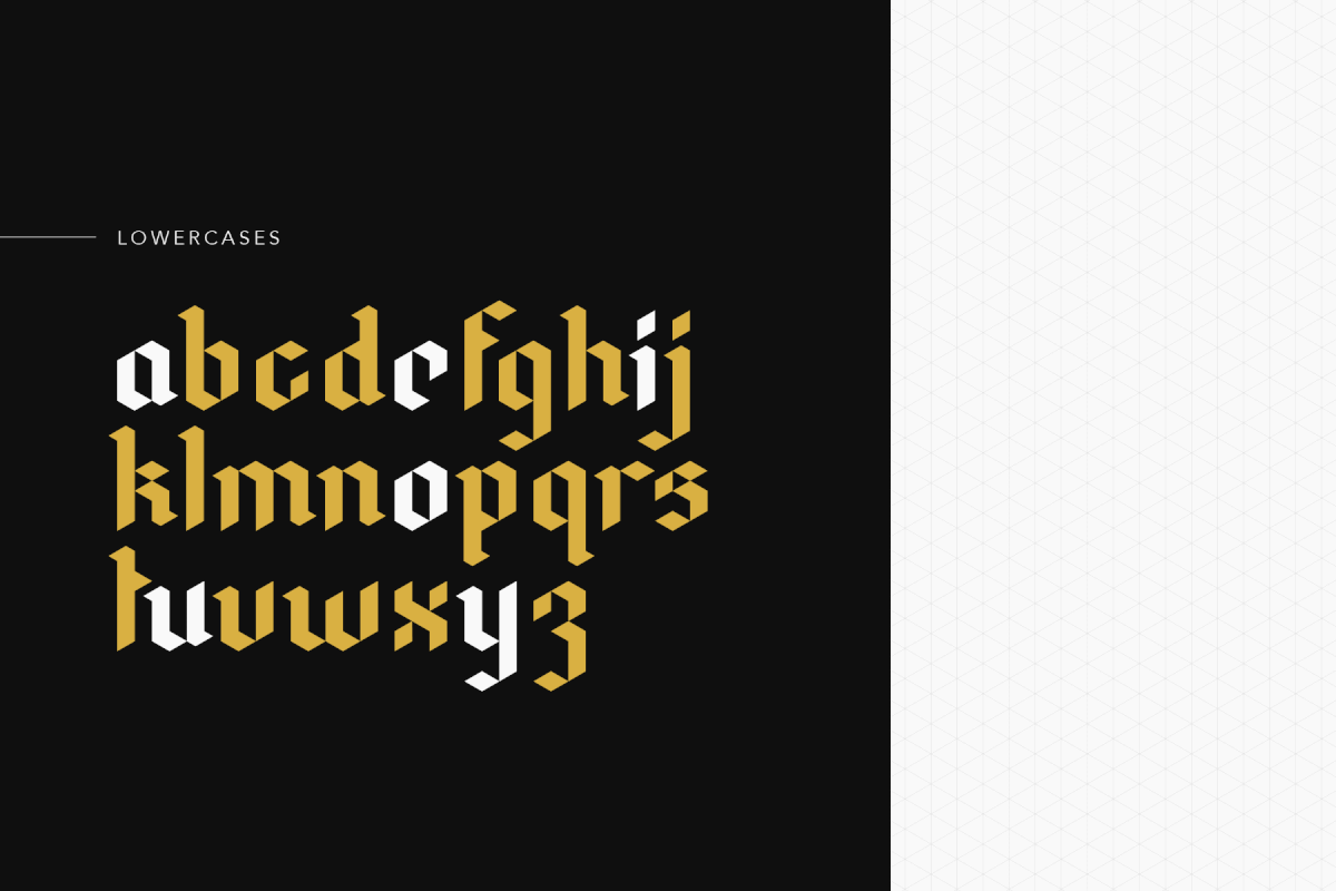 While working on a retro game I made several gothic inspired typeface with a really small square grid. I really enjoyed the constraint of using a low resolution to make font with such style. I reused the same process with DreiFraktur, a geometric typeface with the particularity of being draw with a isometric grid. Each character is made a multiples triangles and respect a strict composition to look like a blackletter typeface and respect the path of a beveled brush.